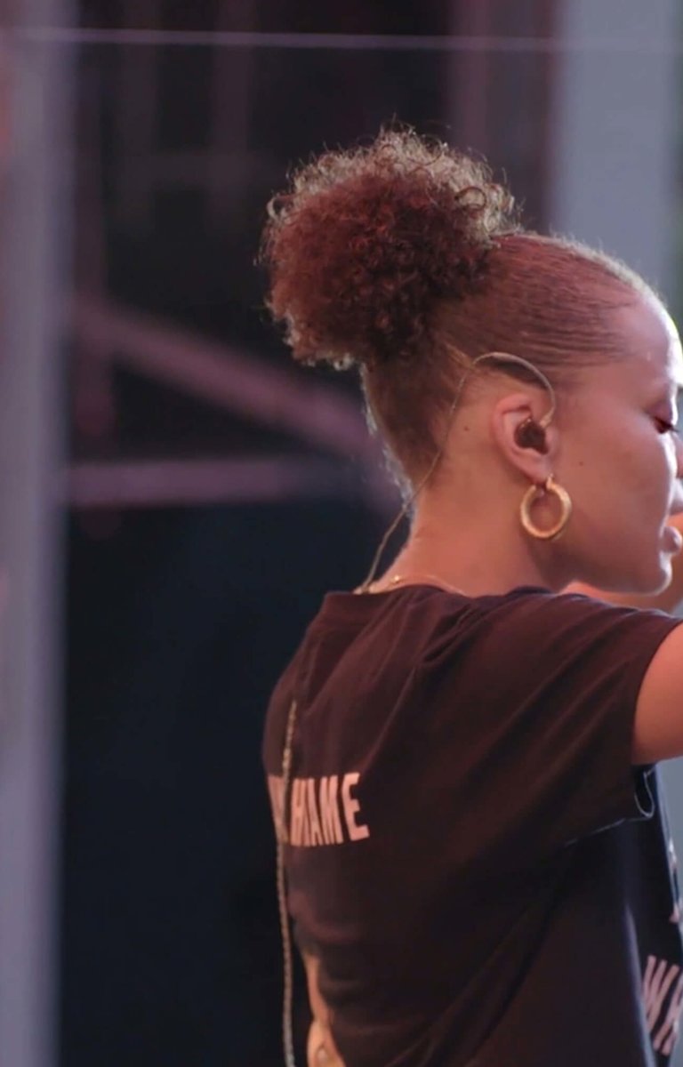 Andra Day looks out on the Hollywood Bowl amphitheater between takes