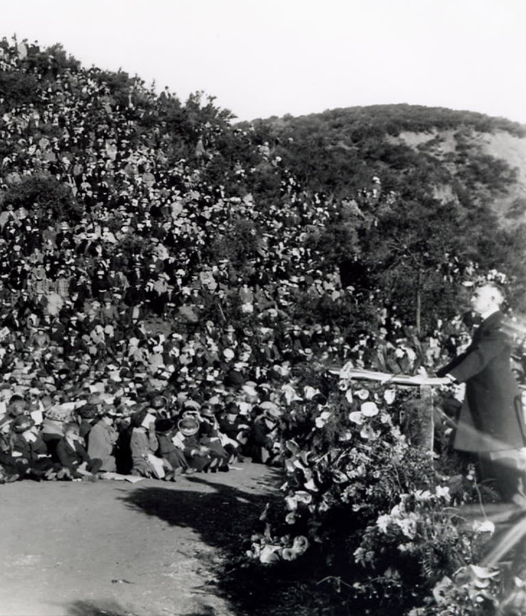 A large crowd sits on a grassy hillside at the first Easter Sunrise Service, 1921. From the California Historical Society Collection at the University of Southern California