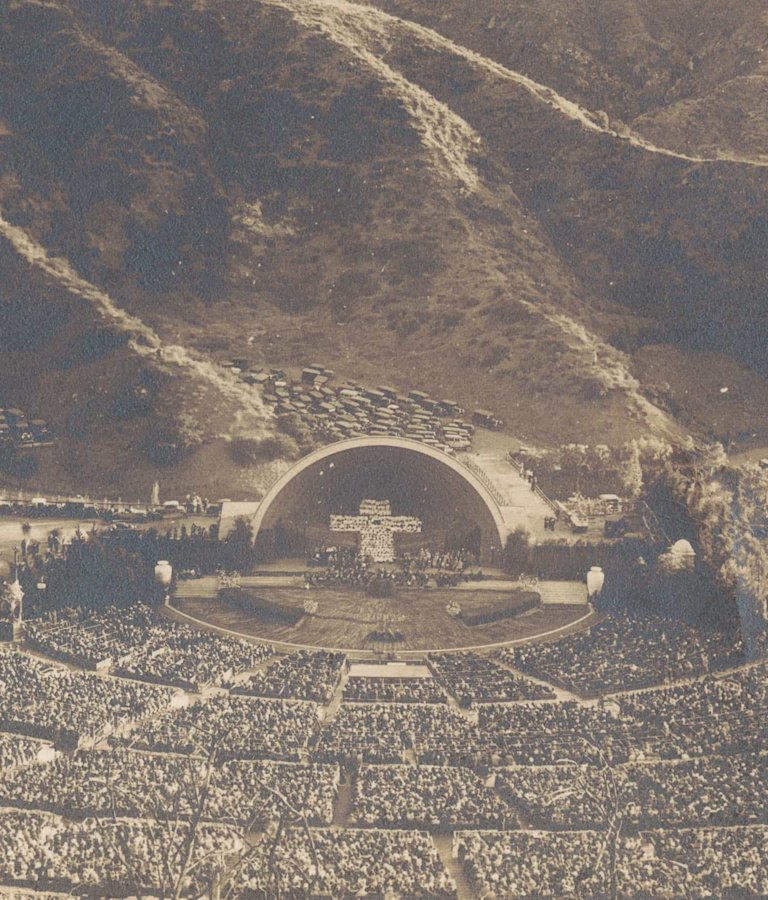 Thousands sat or stood on the grassy hills of the Hollywood Bowl to hear singers, trumpeters, and musicians of the LA Phil perform at the Bowl’s first Easter Sunrise Service in 1921.