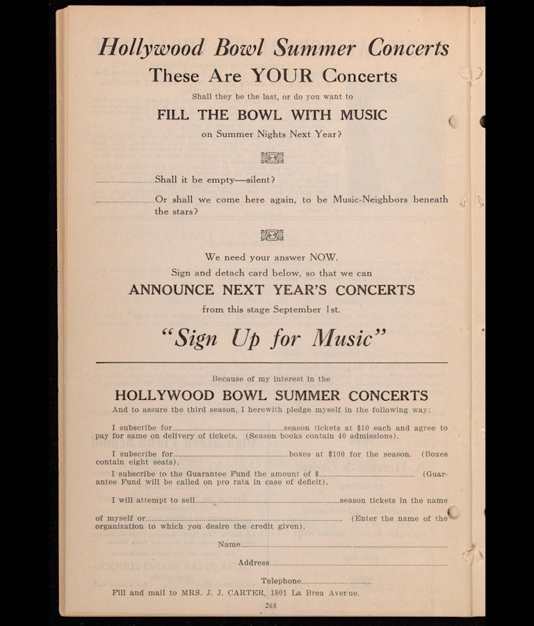 A page from the Hollywood Bowl’s August 28, 1923 program book asks patrons to “Sign Up for Music” and enable future seasons of Symphonies Under the Stars.