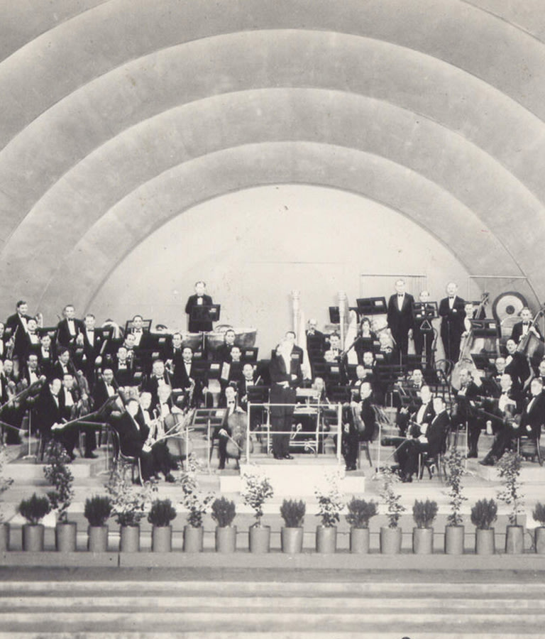 Commemorative postcard depicting the LA Phil on stage at the Bowl in 1929.