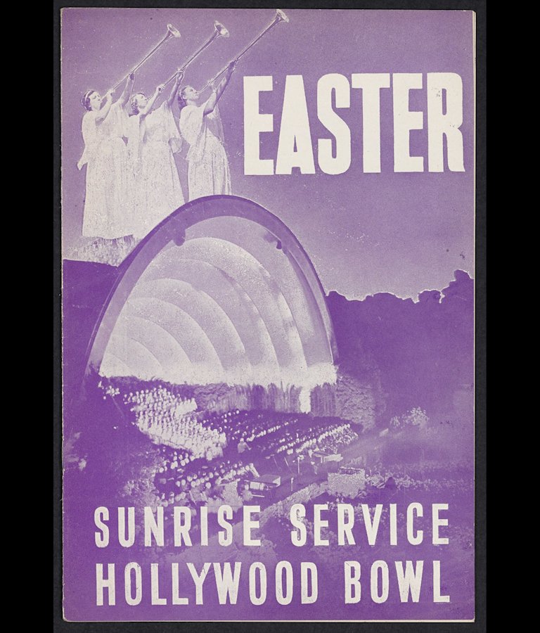 One of the highlights of my work with the LA Phil Archives is uncovering artifacts that tell the orchestra’s story. We recently had the opportunity to digitize all of the Easter Sunrise Service programs in our collections. This playlist includes contemporary versions of songs pulled directly from our 1924-1962 programs, plus a couple of vintage selections. (You can browse the programs here.) As you listen, we invite you to step back in time and picture the orchestra, complete with organ, surrounding a children’s choir arranged as a “living cross” on stage. Women dressed as angels wind their way through a crowd, and the smell of lilies permeates the air. As dawn breaks, hundreds of doves are released into the sky, signaling Easter’s arrival.