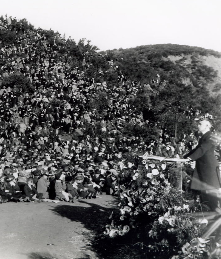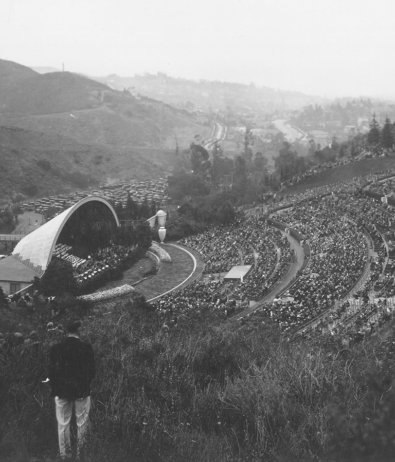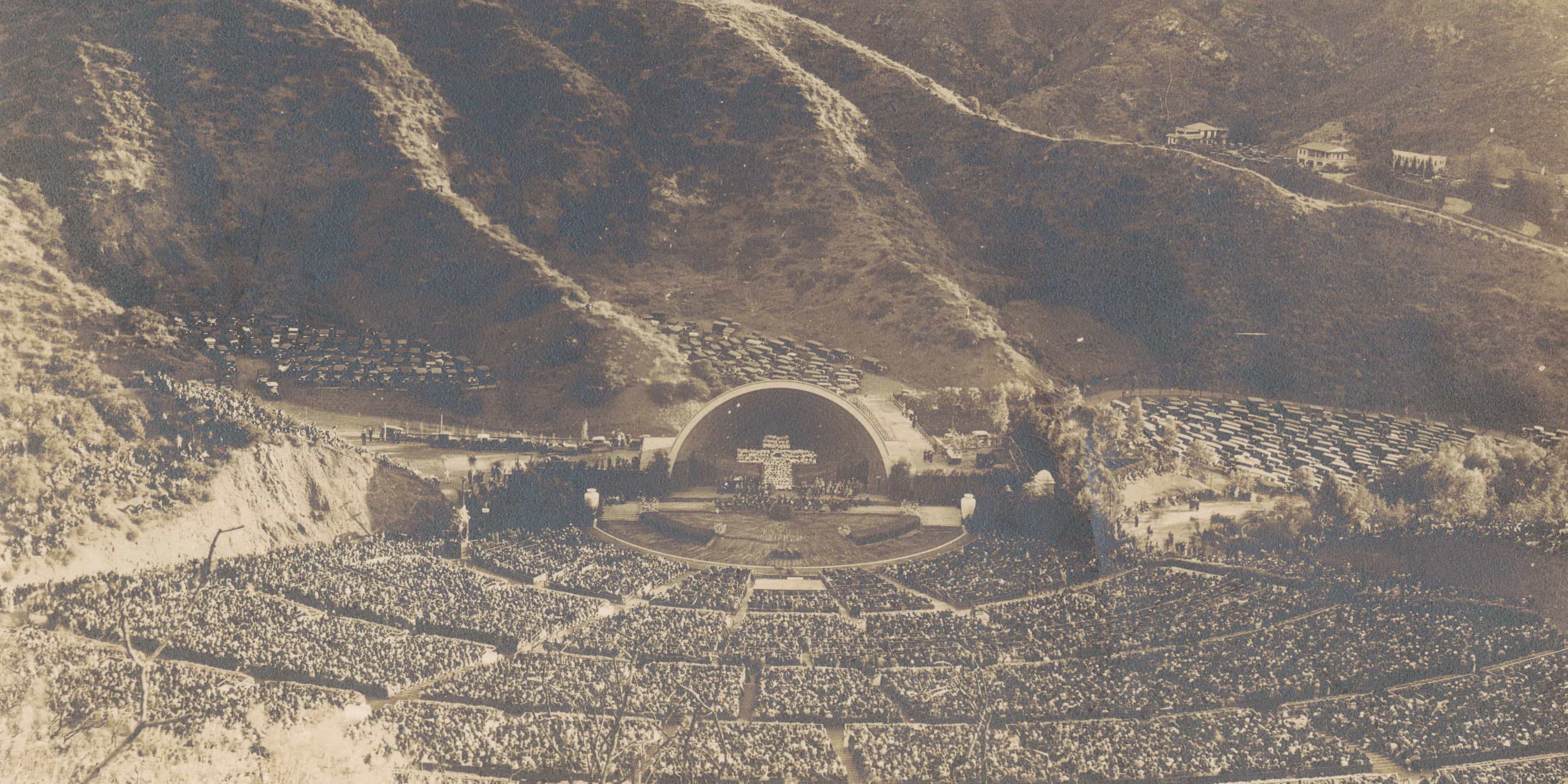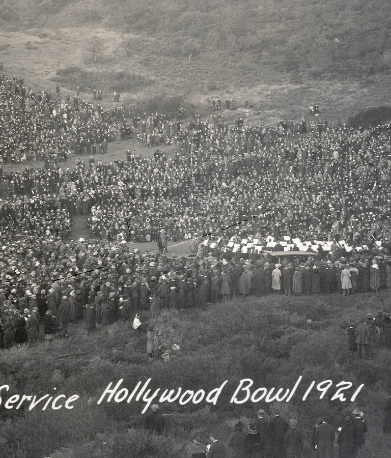 Thousands sat or stood on the grassy hills of the Hollywood Bowl to hear singers, trumpeters, and musicians of the LA Phil perform at the Bowl’s first Easter Sunrise Service in 1921.