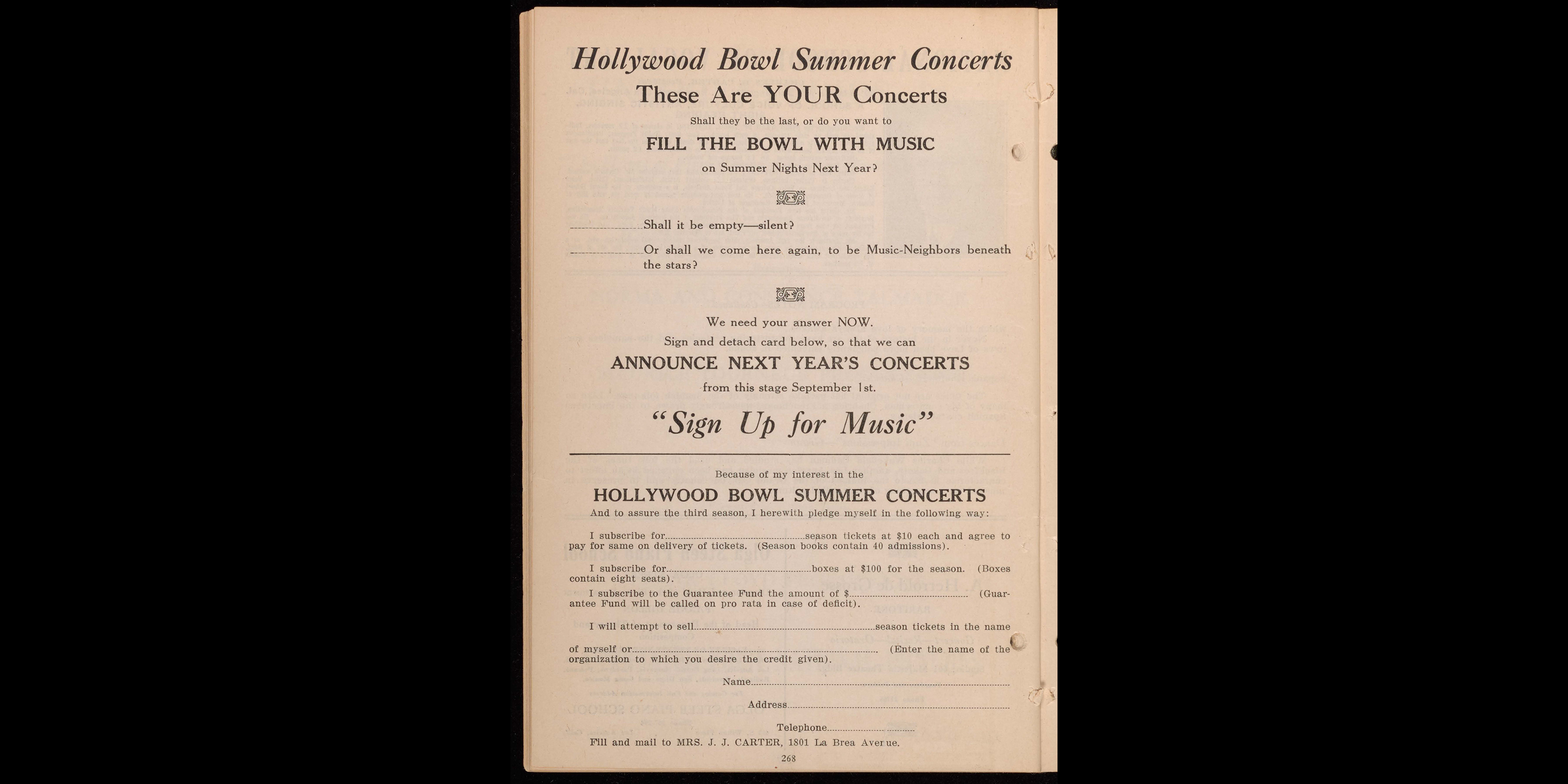 A page from the Hollywood Bowl’s August 28, 1923 program book asks patrons to “Sign Up for Music” and enable future seasons of Symphonies Under the Stars.